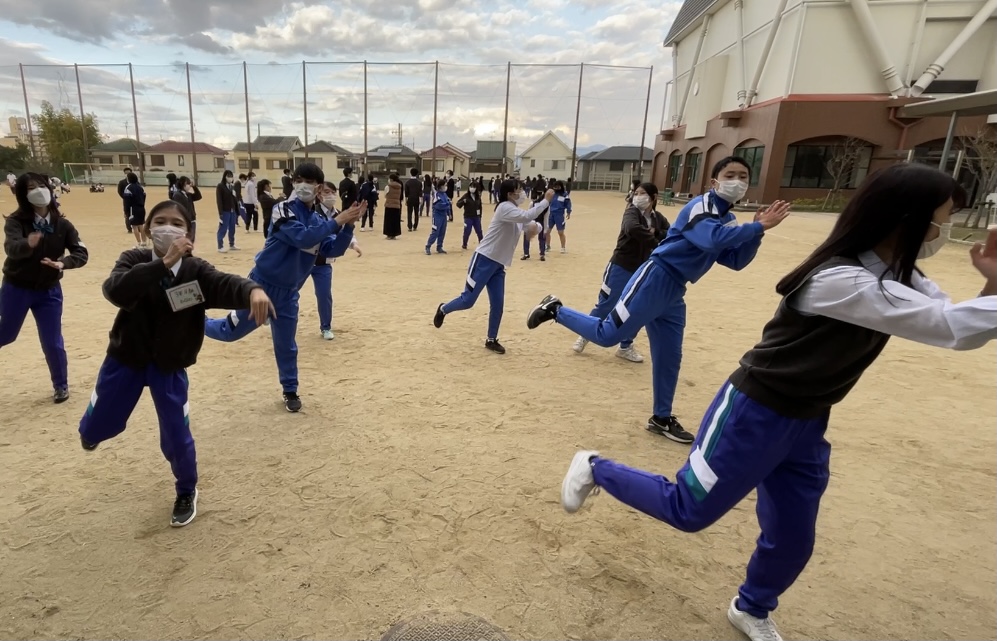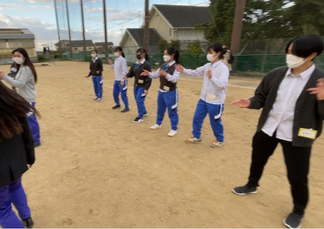 3年生がリードし、後輩たちにダンスを教えます。秋空の下、活気が溢れます。