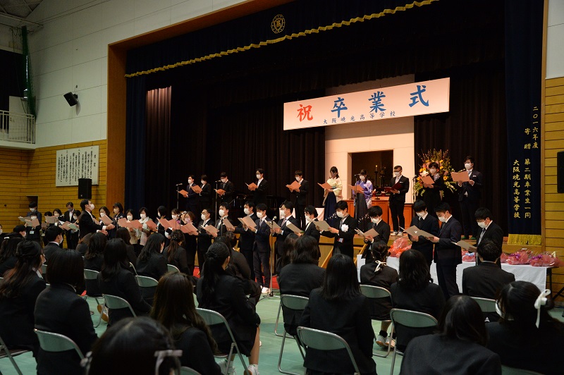 コロナ禍により、式場へは入場制限を設け、在校生と保護者は教室からリモートで視聴していただきました。第一部の卒業証書授与に続き、第二部では3年間の成長を詩と映像で綴る構成詩を卒業式運営委員の生徒が読み上げました。昨日よりも熱のこもった読み上げで、感動的な式典となりました。