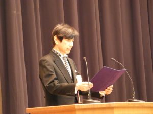 保護者の皆様、この3年間、至らぬ点も多々あったと存じますが、本校教育活動に絶大なるご理解とご協力を賜りましたことに、心より感謝申し上げます。ご来賓の皆様、本日はご多用の中、ご臨席賜りまして有り難うございます。これからも卒業生を温かく見守り、引き続きご指導ご鞭撻を頂きますことをお願い申し上げまして、式辞の言葉と致します。