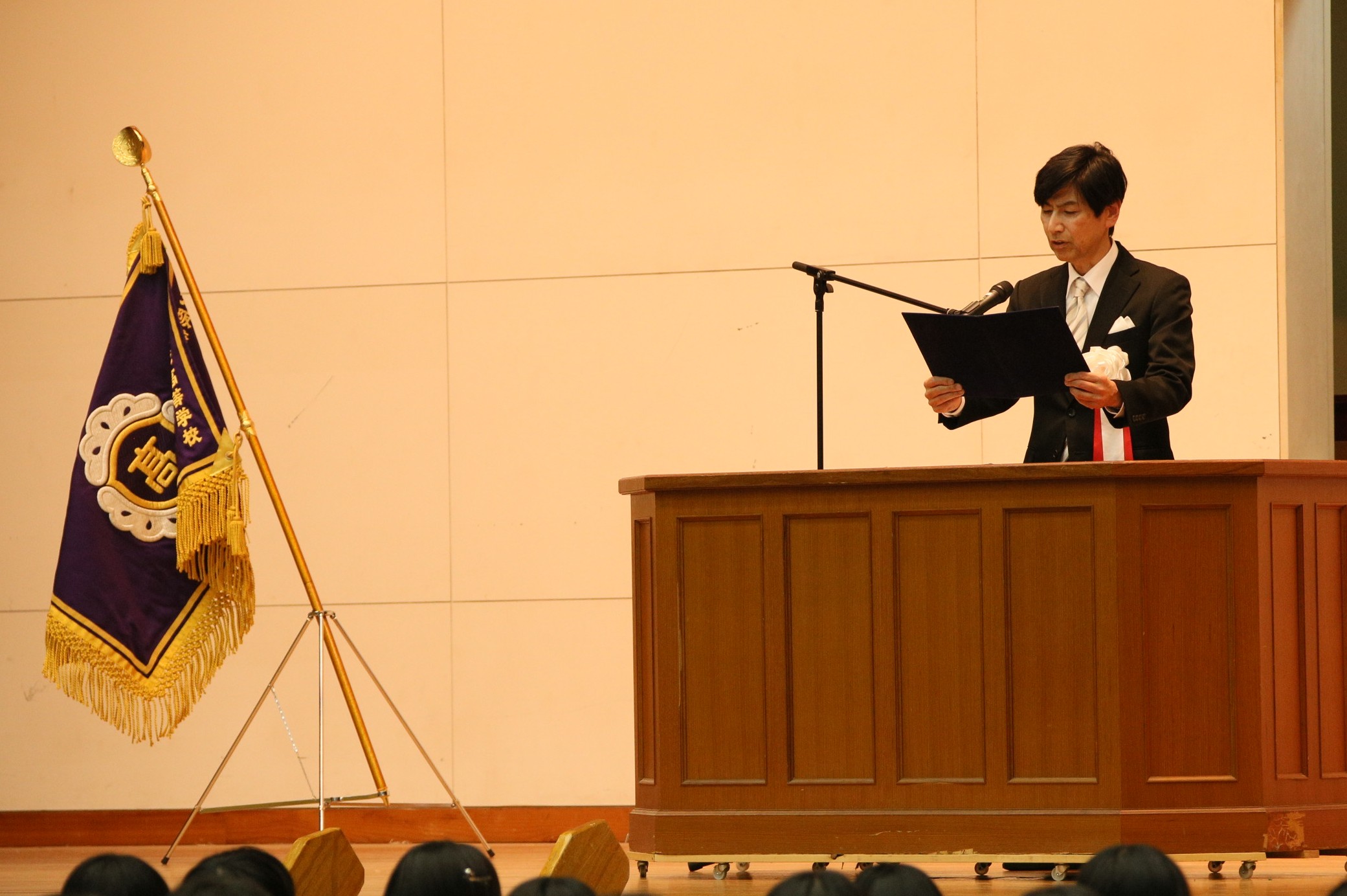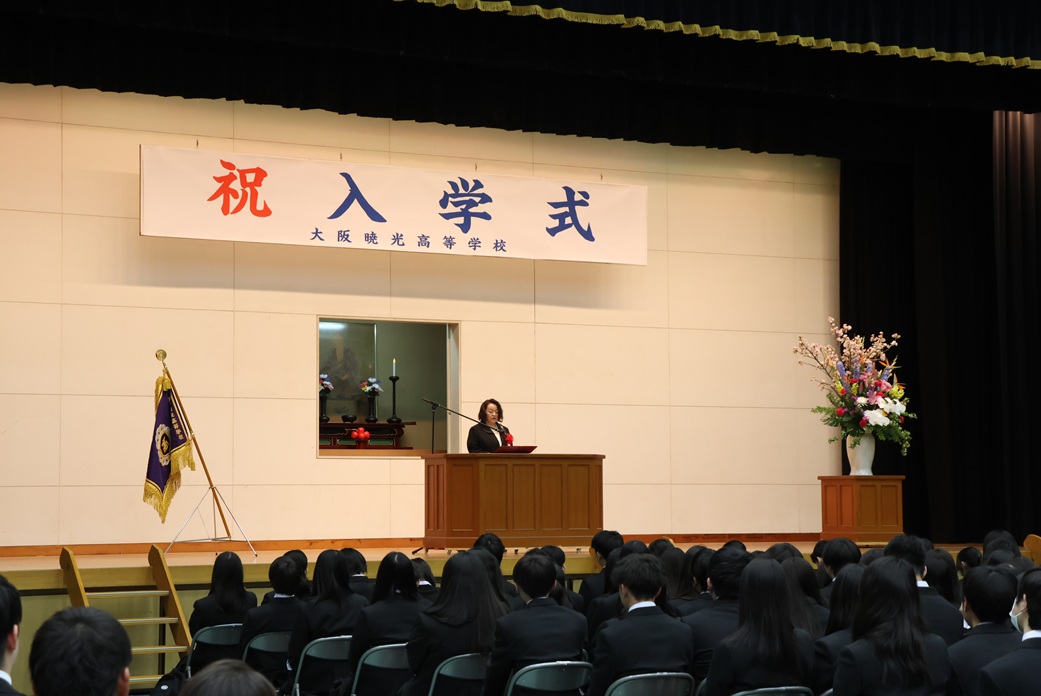 式では、校長式辞、PTA会長祝辞、生徒会長による歓迎挨拶に続き、新入生代表による宣誓が行われました。その後、教職員の紹介がありました。