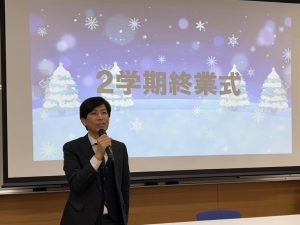 校長先生の講話に続き、生活指導部長の先生から冬休みの過ごし方についての注意喚起があり、その後、空手道部とユニセフ活動の伝達表彰が行われました。