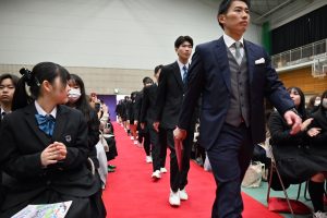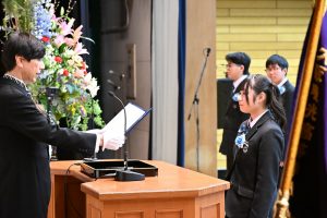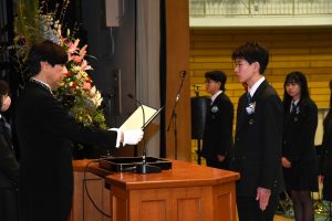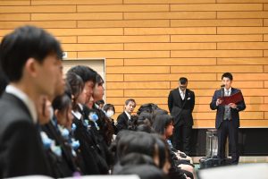第Ⅰ部の卒業証書授与に続き、第Ⅱ部では、3年間の歩みを詩と約800枚の写真でつづった『構成詩』を卒業式運営委員の生徒たちが朗読しました。