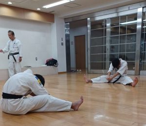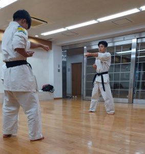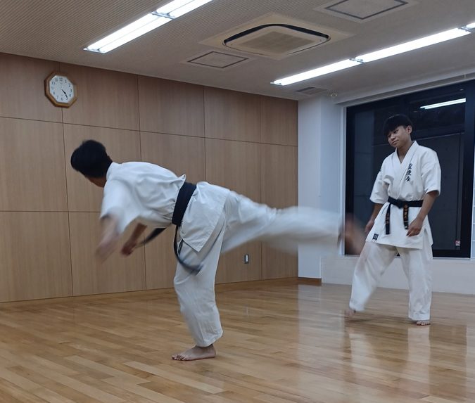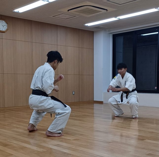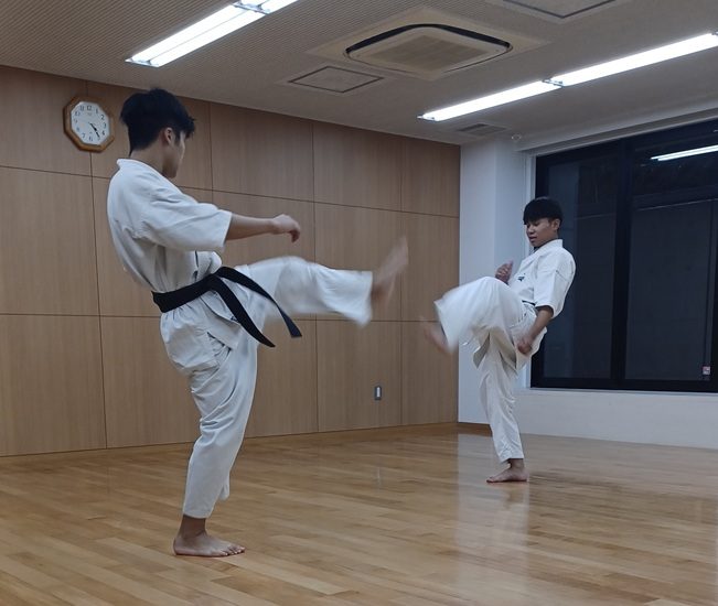 空手部の練習は、ストレッチ、基礎と、体作りから始め、組手や型に進んでいきます。