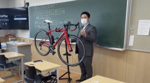 実際に生徒がロードバイクのペダルを手で回し、ギアを変えていくことでペダルが重くなったり軽くなったりすることを体験しました。