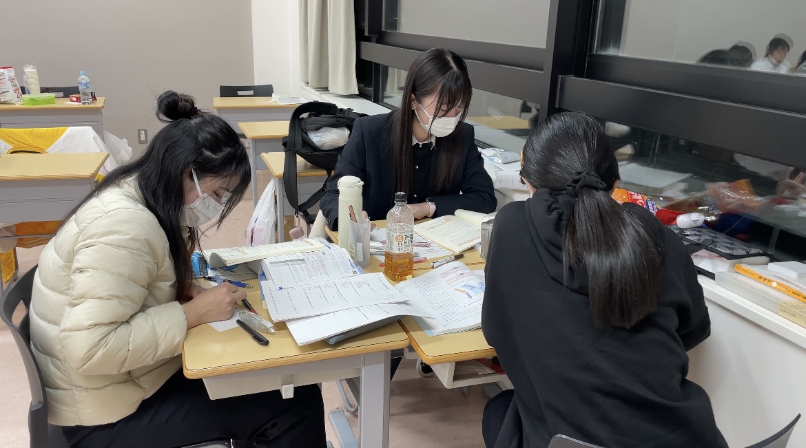 看護専攻科2回生(5年生)は、連日夜7時まで残って、教え合い励まし合いながら国家試験対策のグループ学習をおこなっています!
