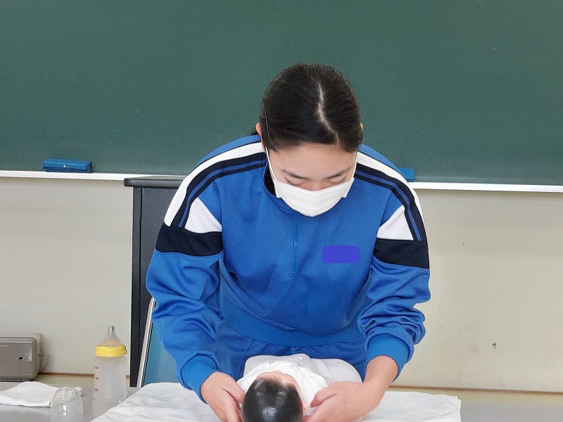 今年の「家庭看護」の課題は”授乳”。どの生徒も緊張しながら言葉がけをしながら、哺乳瓶を使い授乳をしていました。