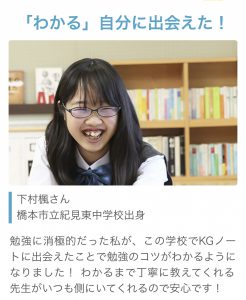 💓基礎学力の向上に向けて、授業だけでなく、本校独自の「KG ノート」(家庭学習ノート)や「放課後学習会」の取組みに力を注ぎます。勉強のやり方がわからない生徒には、勉強方法から丁寧に指導します。