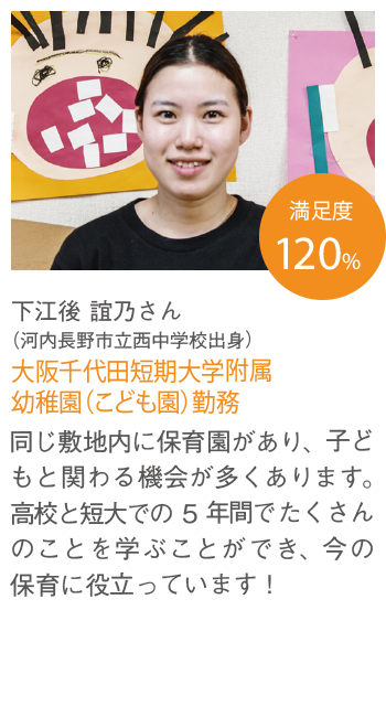 同じ敷地内に保育園があり、子どもと関わる機会が多くあります。高校と短大での5年間出たくさんのことを学ぶことができ、今の保育に役立っています!